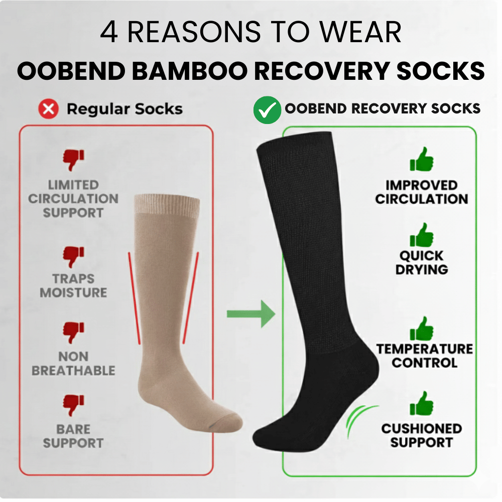 Oobend Bamboo Recovery Socks feature a non-binding, stretchy top that gently fits without squeezing. This design helps improve circulation and reduce swelling—ideal for people with diabetes, neuropathy, or swollen feet. Stay comfortable whether you're on your feet all day or relaxing at home.